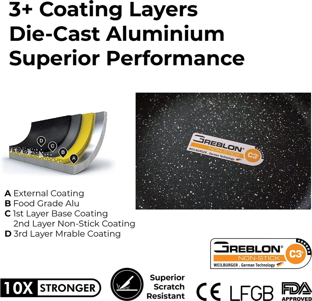 Herenthal inductie pannenset is voorzien van een 3-laagse antikleeflaag, waardoor het 100% vrij blijft van blootstelling aan schadelijke stoffen. En het is zwaar en stevig, voor langdurig gebruik. De pannenset heeft cool-touch ergonomische en hittebestendige handgrepen die zorgen voor comfortabel en veilig koken.