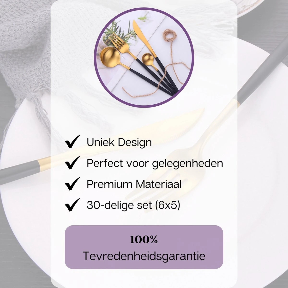 LuZana – Bestek Set Goud – 30-delig – Bestekset 6 Persoons – Goud/zwart – Bestek – Borden – Bestekset Zwart