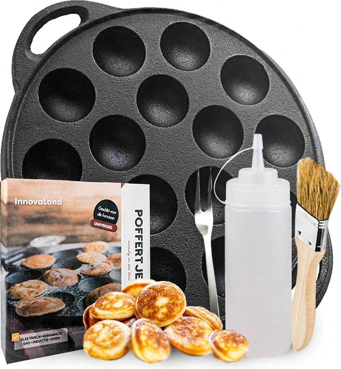 De pan is gemaakt van gietijzer, wat ontzettend makkelijk schoongemaakt kan worden na gebruik. Ook blijven de poffertjes na het invetten of insprayen niet aan de pan plakken.