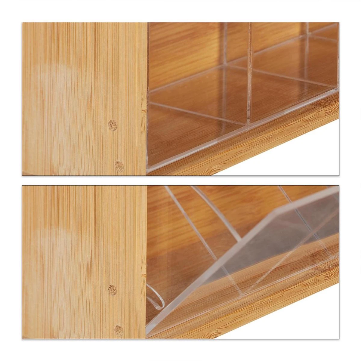 De theedoos van bamboe is de ideale keukenaccessoire voor alle theeliefhebbers! In deze praktische opbergdoos voor thee kun je al je favoriete theesoorten droog en met behoud van aroma bewaren. In de 5 ruime vakken van het theedoosje passen ongeveer 10 theezakjes per compartiment. Dankzij de transparante deksel heb je altijd een goed overzicht over de theesoorten. De houder voor theezakjes wordt ruimtebesparend aan de wand gemonteerd waardoor je altijd snel bij je thee kunt komen.