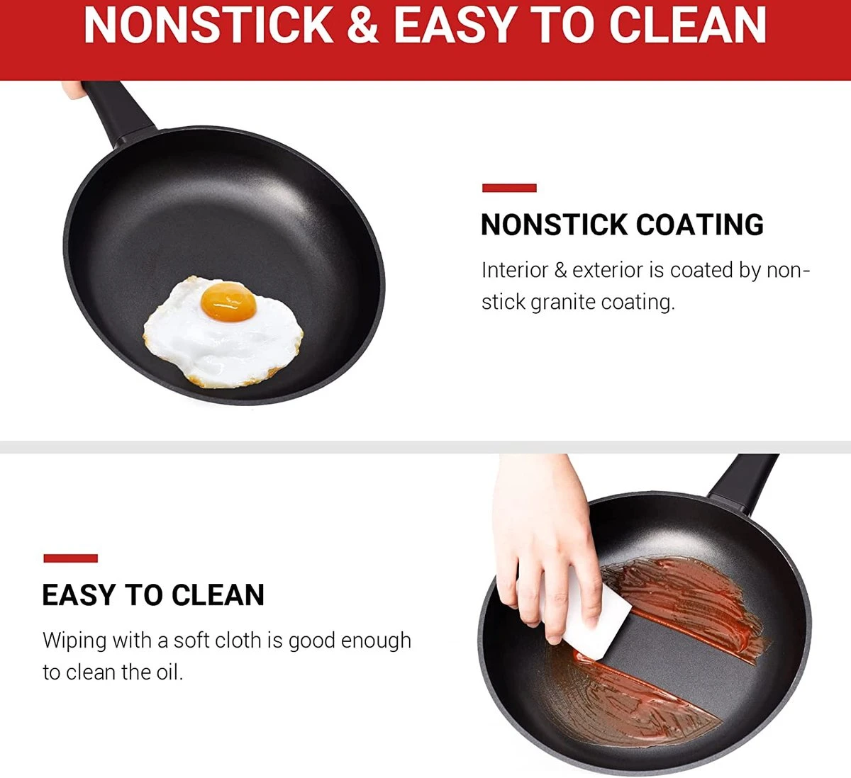 Vanwege de naakte handgrepen genieten deze braadpannen de voorkeur van professionele koks in de gourmetindustrie. U kunt uw voedsel op het vuur bereiden en het vervolgens in de oven gooien zonder de braadpan te verwisselen. Er worden 4 stuks afneembare siliconen handgrepen meegeleverd om de braadpannen bij hoge hitte vast te houden.