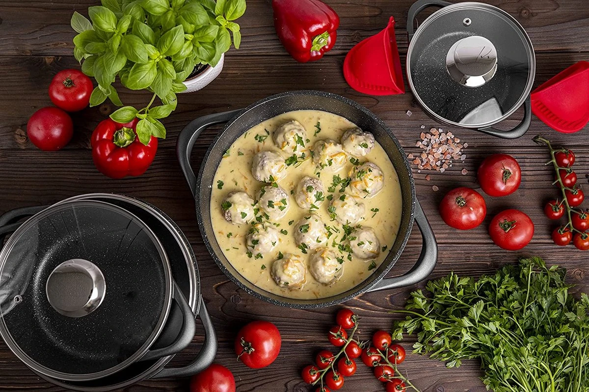 Deze prachtige pannenset van het merk Smile geeft iedere keuken een upgrade. De pannen zijn namelijk geschikt voor iedere kookplaat, waaronder inductie, gas en elektrisch. Ook wanneer jij switcht van huis of keuken kun jij deze pannen dus gewoon blijven gebruiken. Het zwarte materiaal en de glazen deksels zorgen voor een luxe en stijlvolle uitstraling, welke kleur jouw keuken ook is. Naast het mooie uiterlijk zijn de pannen ook nog eens van topkwaliteit; ze zijn allen voorzien van een anti-aanbaklaag, roestvrij stalen knoppen en dikke wanden voor een gelijkmatige warmteverdeling. De perfecte pannenset dus om in te koken, frituren, stoven óf braden.